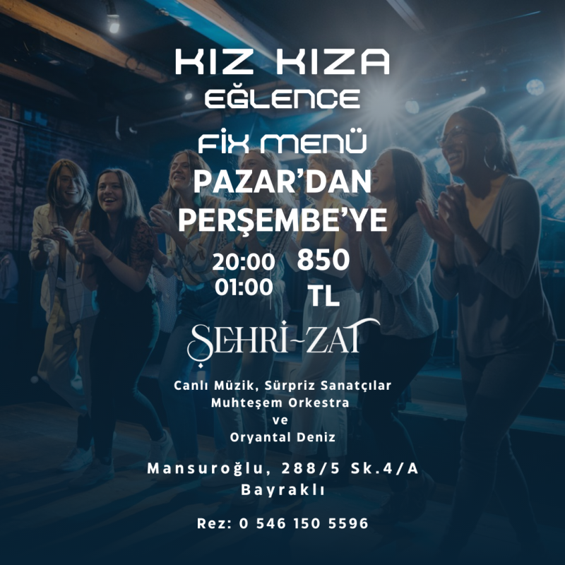 Şehri-zat ailesi olarak özlenen kaliteli eğlence anlayışını getirme misyonumuz ile yola çıkıp, her gece canlı müzik eşliğinde, lezzetli Fix ve A La Carte menü seçeneklerimiz , zengin meze çeşitleri, konforlu oturma alanı, hızlı ve temiz servisimiz eşliğinde, sizlere dostlarınızla güvenle iyi vakit geçirip güzel anılar biriktirebileceğiniz elit mekanımıza muhteşemi deneyimleyebilmeniz için davet ediyoruz.